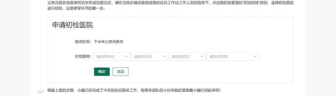 義務(wù)兵報(bào)名信息填寫完畢并成功提交后,請?jiān)诋?dāng)?shù)剜l(xiāng)鎮(zhèn)武裝部或高校征兵工作站工作人員的指導(dǎo)下,點(diǎn)擊我的進(jìn)度里的“初檢初核”按鈕,選擇初檢醫(yī)院進(jìn)行初檢。