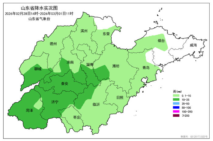 從過程降水情況來看,2月28日14時至3月1日11時,全省共有15市、107縣(市、區(qū))出現(xiàn)降水,平均降水量5.8(毫米,下同),折合水量約9.1億立方米。各市平均:菏澤14.7、泰安13.0、濟寧12.6、聊城10.8、濟南8.4、淄博6.4、濰坊5.4、德州4.0、臨沂3.6、日照2.7、棗莊2.1、濱州1.7、東營1.2、青島0.7和煙臺0.4,威海無降水。