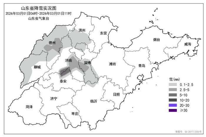 過程降雪來看,2月28日14時至3月1日11時,全省共有6市、23縣(市、區(qū))出現(xiàn)降雪,平均降雪量0.5(毫米,下同)。各市平均:泰安2.5、德州1.6、淄博1.1、濟南0.7、聊城0.7和濱州0.5,其他市無降雪。前3位的是:泰安泰山15.1、淄博博山4.3和德州夏津3.7。最大積雪深度排前3位的是:泰安泰山3厘米、德州平原2厘米和德州夏津0.1厘米。
