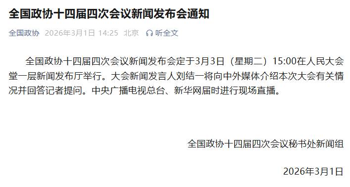 全國(guó)政協(xié)十四屆四次會(huì)議新聞發(fā)布會(huì)定于3月3日(星期二)15:00在人民大會(huì)堂一層新聞發(fā)布廳舉行。大會(huì)新聞發(fā)言人劉結(jié)一將向中外媒體介紹本次大會(huì)有關(guān)情況并回答記者提問(wèn)。中央廣播電視總臺(tái)、新華網(wǎng)屆時(shí)進(jìn)行現(xiàn)場(chǎng)直播。