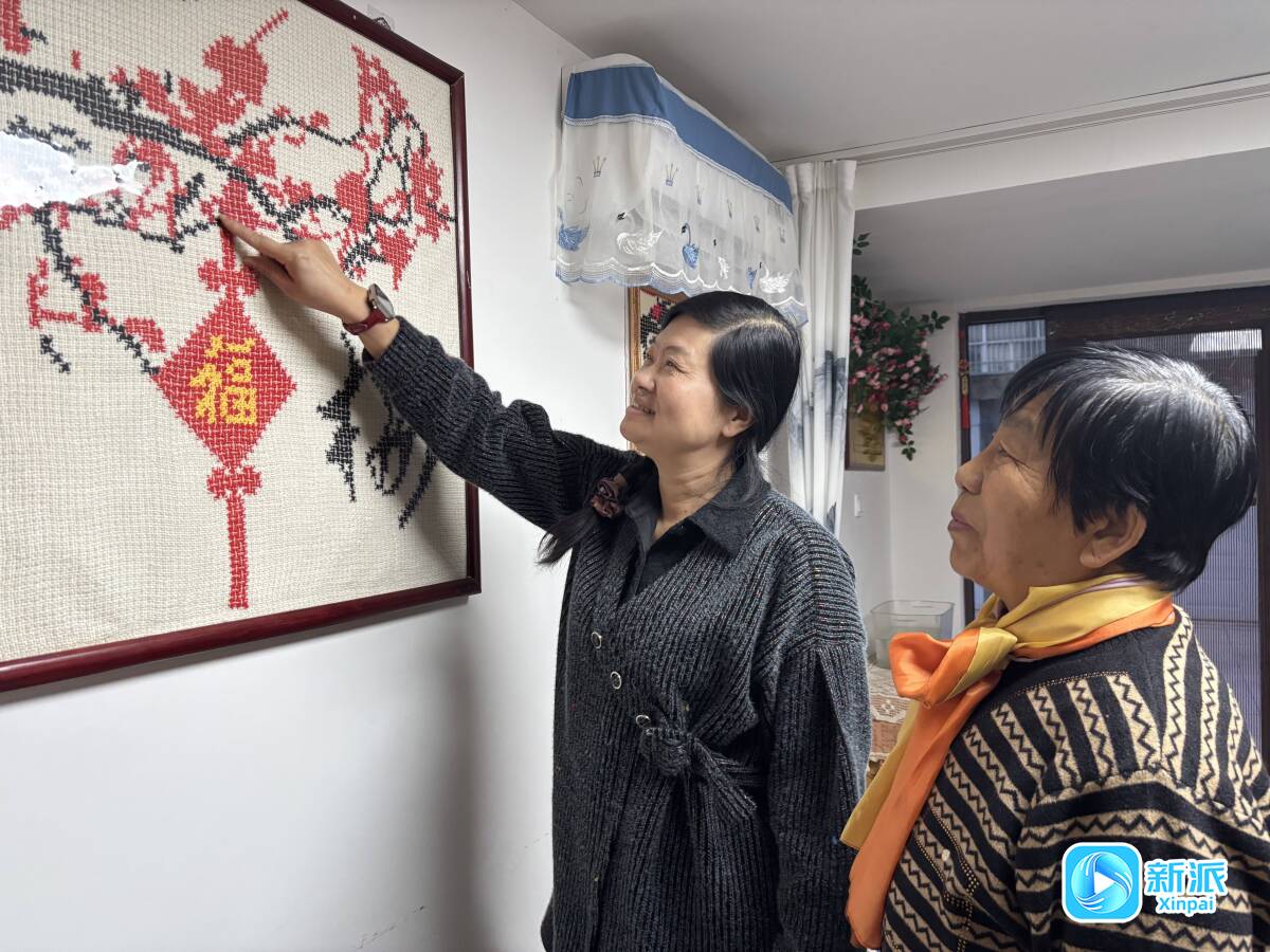 張素梅的“小屋”由車庫改造而成,既是她深耕筆墨、傳承手藝的工作室,也是與文友、鄰里閑話家常、品讀歲月的會(huì)客廳。當(dāng)日,記者冒雨走進(jìn)這間20平方米的小屋,瞬間被滿滿的生活溫度與文化氣息包裹:屋內(nèi)兩個(gè)書櫥整齊雅致,兩側(cè)墻面掛著的精致網(wǎng)扣繡花作品與書法作品相映成趣,幾個(gè)老姐妹圍坐一起,捧著《飛閱濰河:我的故土與遷徙記憶》書稿細(xì)細(xì)品讀,不時(shí)輕聲交流幾句。窗外細(xì)雨淅瀝,屋內(nèi)暖意融融,動(dòng)靜之間,盡是歲月靜好。